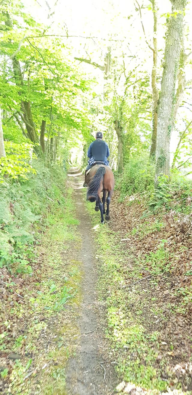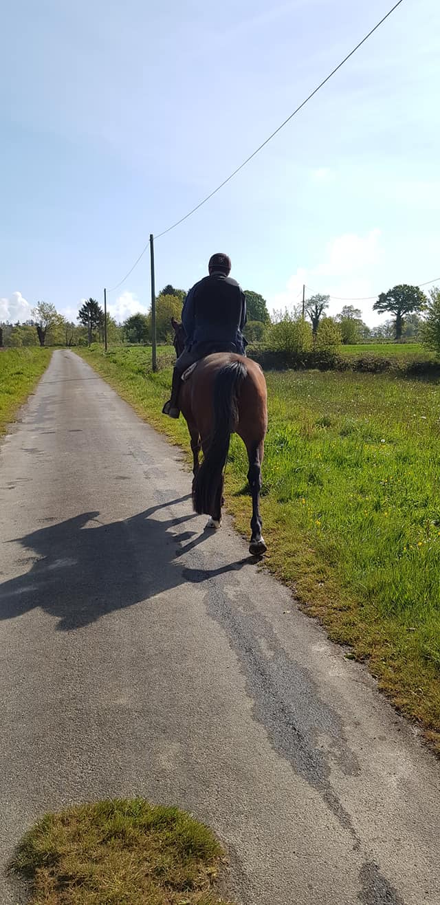 Dan a fait sa dernière balade bien gérée par son propriétaire. Objectif: du pas rênes semi longues, un peu de trot avec son propriétaire qui devait être stable jambes-buste-mains.